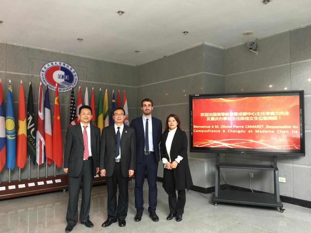 必赢官网中法2+2全体学生和部分法语专业学生共近100名学生参加了宣讲会。通过该宣讲会,同学们进一步了解了法国的高等教育体制和面签的注意事项,明确了赴法的学习和生活,增强了学习法语的动力。宣讲会后,李奥力先生还愉快地回答了同学们的提问。在宣讲会前,学院赵驹院长、陈集平部长接待了李奥力先生和陈佳女士。