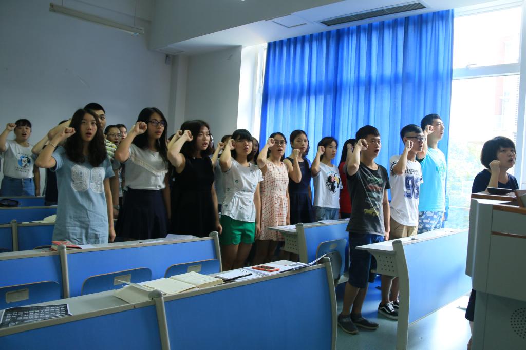 第五,全体党员重温入党宣誓环节,仪式伊始,由学生二支部组织委员田莎老师领誓,来自我支部的34名学生党员一致举起右手,面对党旗庄重宣誓。