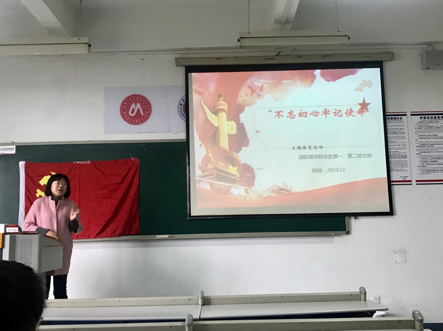 随后,进入第二个会议流程,党支部书记汪洁老师带领大家展开了“不忘初心,牢记使命”的主题教育活动,并结合自身参观白公馆、渣滓洞等革命教育基地的经历,阅读《红岩》等书刊的心得感悟,带大家进一步提高对党认识,普及了相关党课知识。