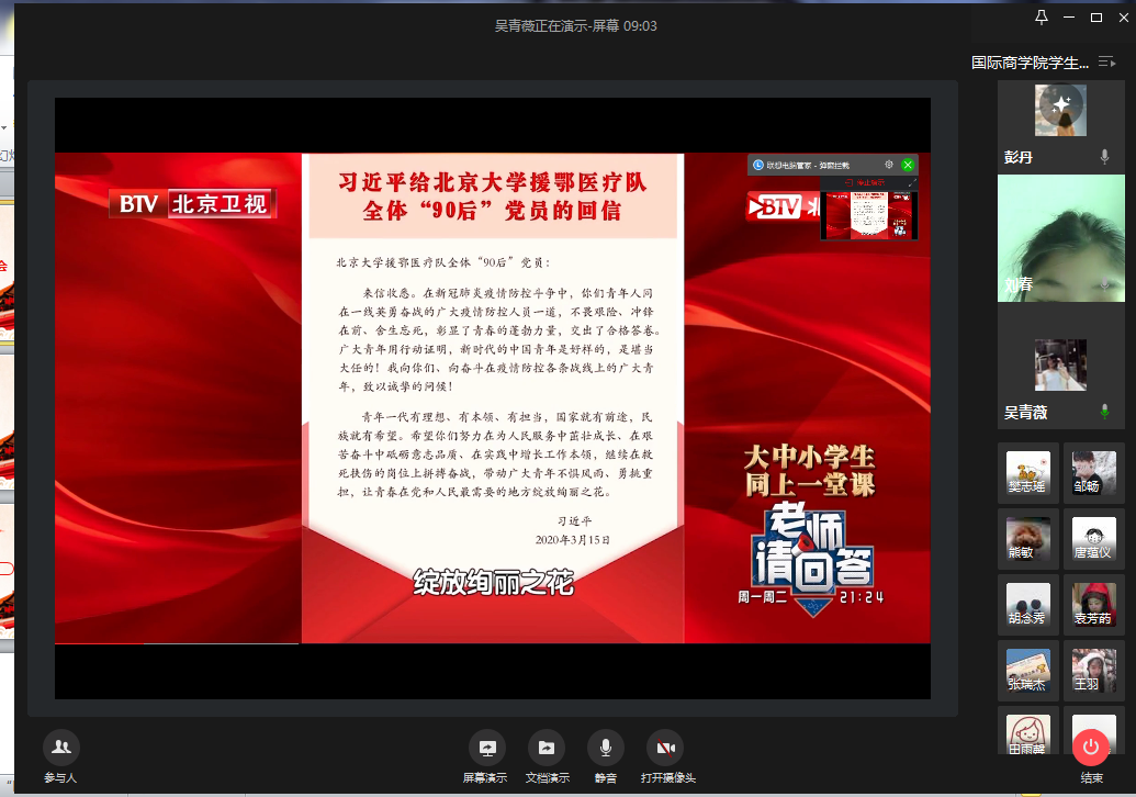 紧接着,吴青薇同学针对《习近平总书记给北京大学援鄂医疗队全体“90后”党员的回信》、《习近平总书记在二十国集团领导人特别峰会上的重要讲话》以及中央应对新冠肺炎疫情工作领导小组会议精神等多个内容,有序展开了说明,帮助大家对近来习近平总书记的讲话和党中央的会议精神进行更深入的理解,参会人员都仔细而又认真地聆听着,对防疫工作者的无私奉献而动容,同时也对我国的疫情防控工作的成功有了更坚定的信心。