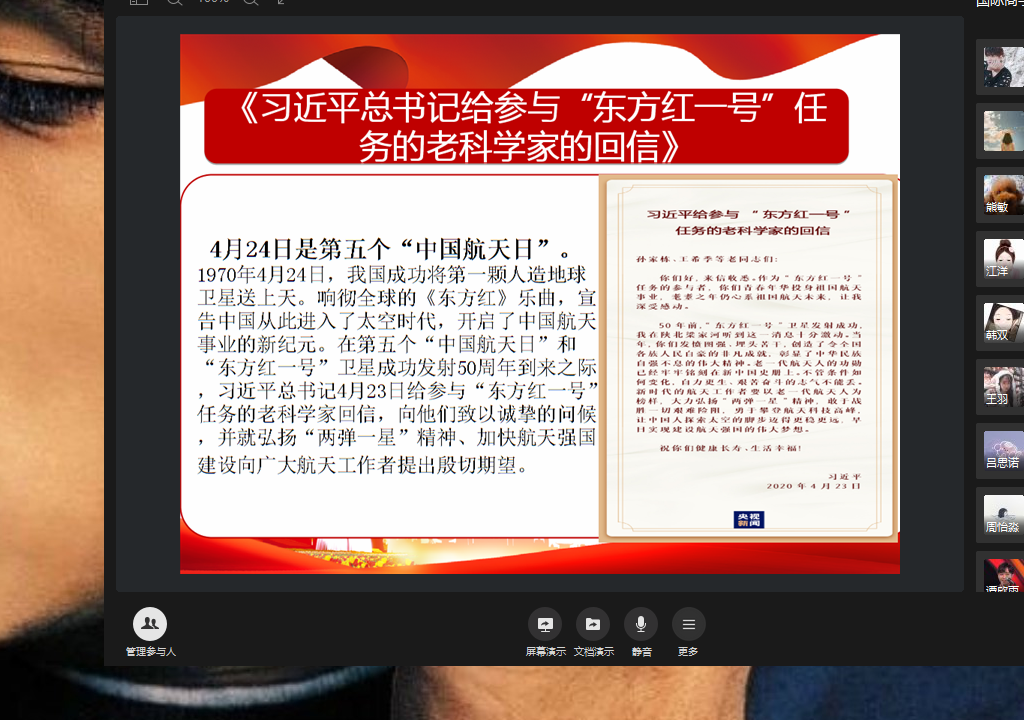 2020年5月19日,必赢242net官网学生第一支部在企业微信中开展五月线上组织生活会,党支部的邹畅同志和唐蕴仪同志带领大家学习习近平总书记在陕西考察重要讲话精神、习近平总书记浙江考察重要讲话精神、《习近平总书记给参与“东方红一号”任务的老科学家的回信》。以及西迁精神、全国两会精神以及学校关于疫情防控的相关要求。西迁精神”是在1956年交通大学由上海迁往西安的过程中,生发出来的一种宝贵的精神财富。1955年4月,国务院作出交通大学内迁西安的重大决定。自1956年首批师生开赴西安,到1959年迁至西安的交通大学主体部分定名为西安交通大学,交大西迁历时四年,迁校总人数达一万五千余人。2005年12月6日,经西安交大党委会议审议批准,交大西迁精神概括为“胸怀大局,无私奉献,弘扬传统,艰苦创业”16个字。