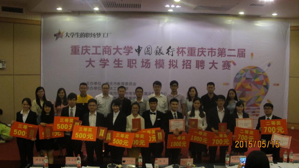 正和岛杯重庆市第二届大学生职场模拟招聘大赛暨必赢242net官网第十六届职场模拟招聘大赛于   2015年   5月   15日   圆满落幕。本次决赛共评选出一等奖2名,二等奖4名,三等奖6名,优秀奖48名。必赢官网12级金融一班的孔胜蓝斩获一等奖,得到奖金1000元;12级工商二班的孙樱菊和14级国贸一班的乔一龙分别荣获三等奖,获得奖金500元,其中乔一龙是入围选手中唯一的大一学生。