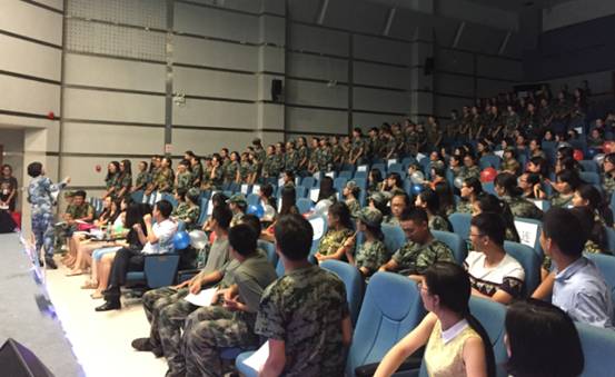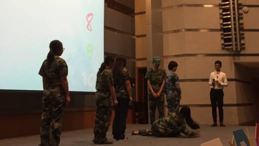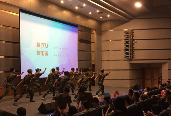 表演过程中设置的互动环节“军歌接龙”和“你比我猜”,每个连队在教官的带领下踊跃参与,全场气氛达到高潮。