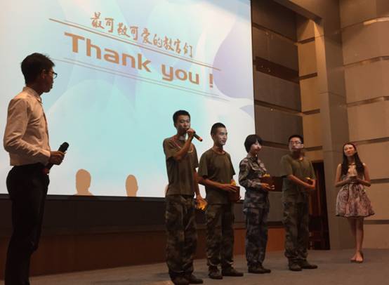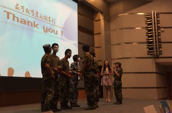 军训,磨练了同学们的意志,增进了同学之间的友谊,也让同学们认识了一群可亲可敬可爱的教官。12天的艰辛即将结束,我们有不舍,有感动和成长。汇演最后,各连同学代表向教官送上小礼物表达了真挚的感谢之情。