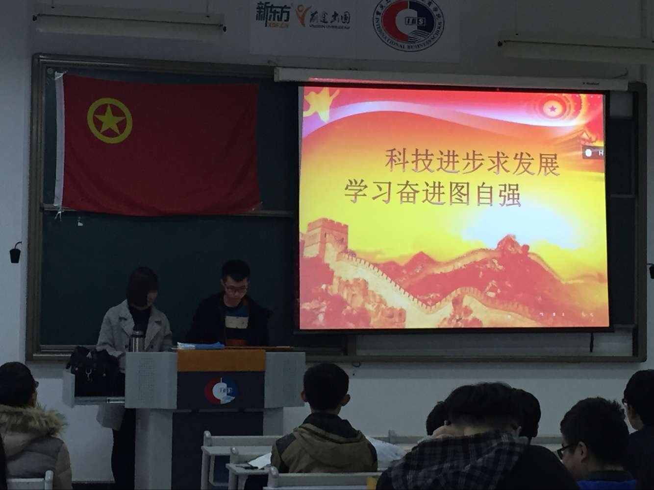 本次活动的主题是“科技发展求进步,学习奋进图自强”。在两位主持人精彩的开场后,同学们首先迎来的是一段讲述“大国崛起”的视频,早已看得热情澎湃的同学们也交流了有关当今社会的发展和变化的看法。同样,在近期发布在各大平台上的热点实事的“有奖问答”环节中,同学们也积极发言,各抒己见。随后,通过播放“开学第一课——朗朗讲述怎么成为钢琴大师”视频,引出了下一环节——“一年之间的变化”,大家都对这一年的点点滴滴感慨良多。最后,主持介绍的几位感动校园人物的优秀事迹感动了在场所有人。本次活动圆满结束。