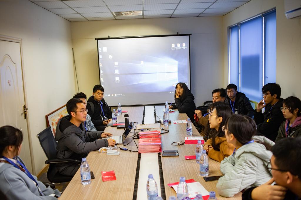 一来到九零部落的办公地点,我们就受到了陈强校友的热烈欢迎,庞助理与校友互致问候。接着,陈强校友带领我们参观了公司办公区域,他首先向我们介绍了目前公司的概况和发展历程。九零部落注册成立于2015年,在2017年末全面转型做IT软件的外包研发,并于转型后立即承接了九零部落的第一个项目——听歌识曲;公司在2018年建立第一个海外运营项目,并在当年7月实现了营收破百万。在九零部落的会议室落座之后,陈强校友通过PPT继续向我们介绍公司的企业文化、组织架构等,还列举了一些前期的项目,如百雀羚商城等。据他介绍,九零部落也致力于公益项目,如为大鱼公益提供技术支持,积极履行企业的社会责任。