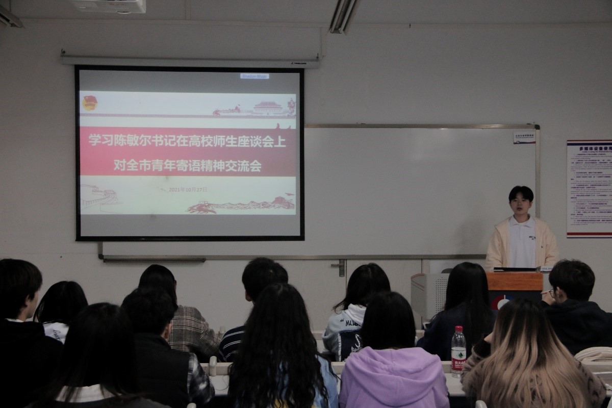 首先,学生会主席团成员曹雨霖同学上台进行学习会第一部分“聊学习生活”的阐述。曹雨霖同学提到,陈书记对全市青年寄予厚望,希望大家要以实现中华民族伟大复兴为己任,勇担时代使命,练就过硬本领,志存高远、脚踏实地,努力从书本中汲取智慧和营养,在实践中增长才干和本领,勇做走在时代前列的奋进者、开拓者、奉献者,在奋斗中释放青春激情、追逐青春理想;做到知行合一,以真才实学服务人民,以创新创造贡献国家。