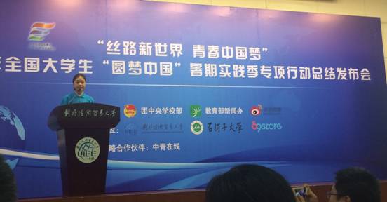 2015年11月30日,“丝路新世界·青春中国梦”2015年全国大学生“圆梦中国”暑期社会实践专项行动总结发布会在对外经济贸易大学举行。团中央书记处书记傅振邦、团中央学校部部长杜汇良和来自全国100多所参与高校师生代表参加了会议。必赢242net官网社会实践服务团荣获七项优秀荣誉,应邀参加了此次发布会,并作为六位优秀代表之一就“社区宣讲”专项发言。