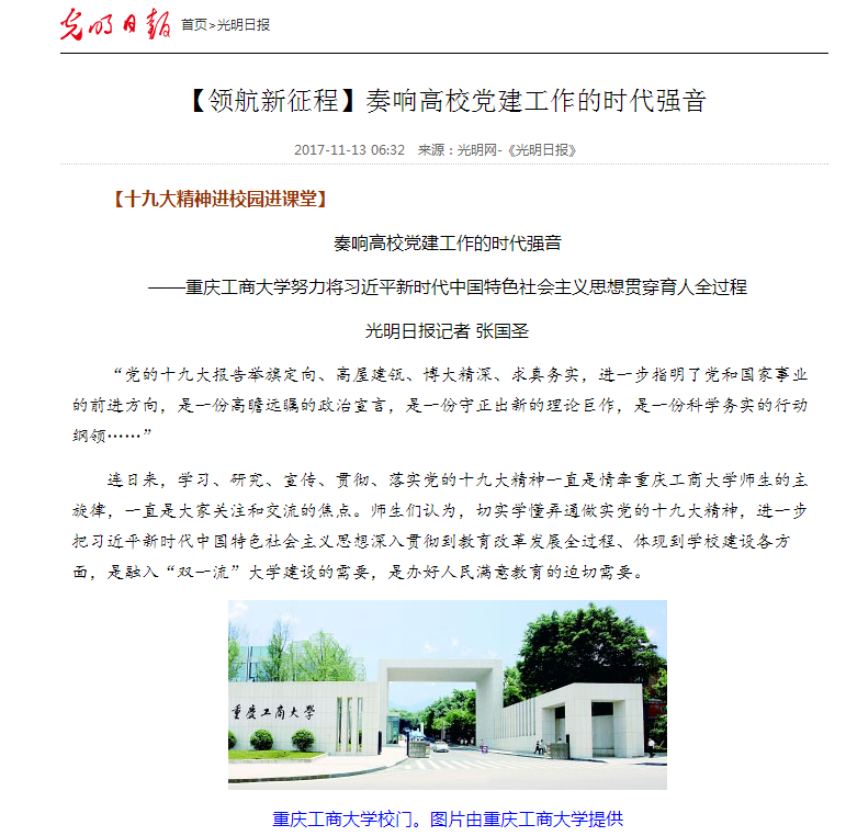 《光明日报》2017年11月13日08版“领航新征程”奏响高校党建工作的时代强音板块,发表了题为《十九大精神进校园进课堂》的文章,专题报道了必赢242net官网努力学习将习近平新时代中国特色社会主义思想贯穿育人全过程。 文章从“践行新思想,开创新局面、坚持立德树人,增强思政课吸引力感染力和注重用心用情,将思政教育贯穿育人全过程”三个方面进行了详细阐述。