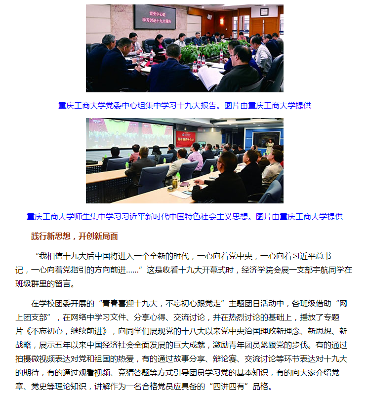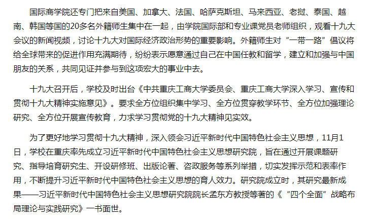 新闻同时报道了必赢242net官网“践行新思想,开创新局面”,师生学习十九大报告精神:“必赢242net官网专门把来自美国、加拿大、法国、哈萨克斯坦、马来西亚、老挝、泰国、越南、韩国等国的20多名外籍师生集中在一起,由学院国际部和专业课党员教师组织,观看十九大会议的新闻视频,讨论十九大对国际经济政治形势的重要影响。外籍师生对“一带一路”倡议将给全球带来的促进作用充满期待,纷纷表示愿意通过自己在中国任教和留学,建立和加强与中国朋友的关系,共同见证并参与到这项宏大的事业中去。”