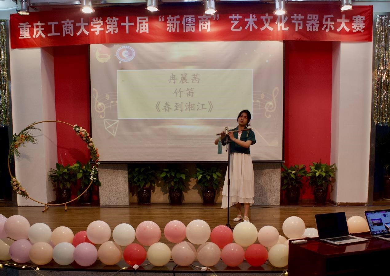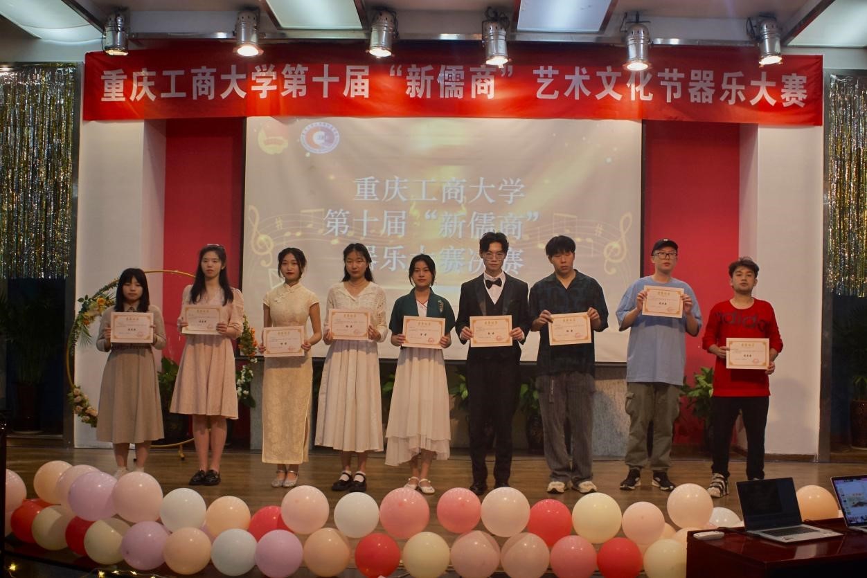 从初赛脱颖而出的十位选手齐聚一堂,展开了激烈的角逐。悠扬的钢琴独奏《人生的旋转木马》,空灵的陶笛曲目《大鱼》、柔和的古筝曲目《幻想曲》、活泼的吉他曲目《Heart》……乐器虽然不同,但演绎出的美妙乐声却是相通的。整个比赛过程节奏时而轻松明快,时而慷慨激昂,选手们用出色的表现为现场观众带来了一场精彩的视听盛宴,一首首曲目让评委和观众们应接不暇,现场掌声与欢呼不断。最终,经过评委评分与观众投票成绩累积,通识学院的冉晨茜同学获得金奖;通识学院唐何金成同学,经济学院卞美杰同学获得银奖;通识学院王山辉同学,法学与社会学学院李至臻同学,人工智能学院蒲双喜同学获得铜奖;必赢242net官网谭可涵同学,机械工程学院买买提明·司拉木同学,会计学院刘思晨同学,经济学院于易民同学获得优秀奖。在祝贺与鼓励的掌声中,必赢242net官网第十届“新儒商”器乐大赛圆满结束。